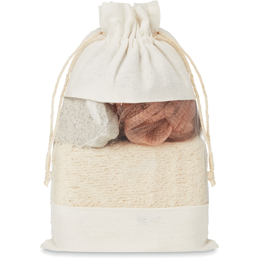 Set med badsvamp, badsten och puff. Trycket sker på presentpåsen.