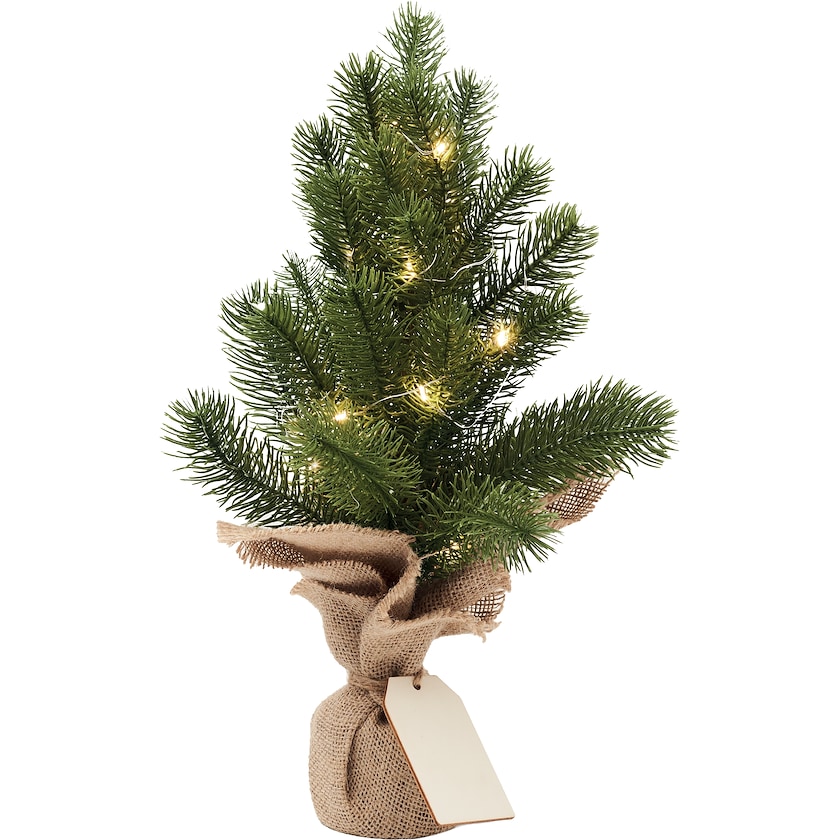 Konstgjord julgran i miniformat. Julgranen är upplyst av 20 st LED-ljus och står i en julsäck av jute. Trycket sker på en etikett av trä. Perfekt för kontoret!