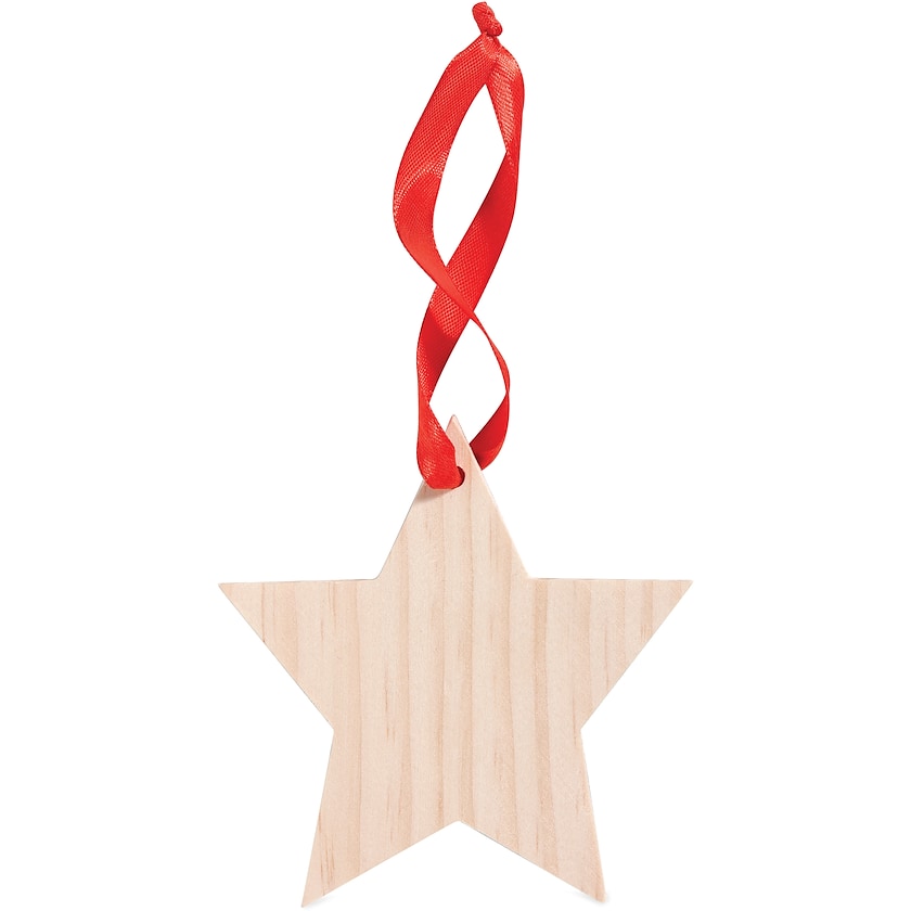 Trästjärna med rött band att hänga i julgranen. Märkning kan antingen ske med tryck eller lasergravyr.