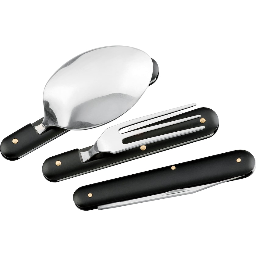 Set med tre ihopfällbara bestick. Perfekt för dig som är ute i naturen! Levereras i svart förvaringspåse.