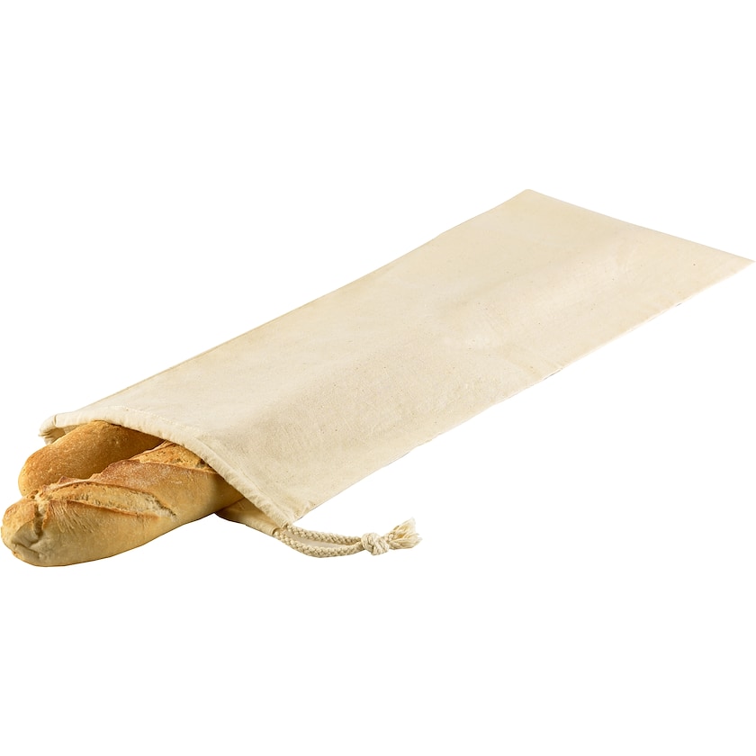 Dragskoförsedd brödpåse av naturfärgat bomullstyg. Påsen är tänkt att användas när man handlar bröd i butiken. Beställ brödpåsar med tryck hos Axon Profil!