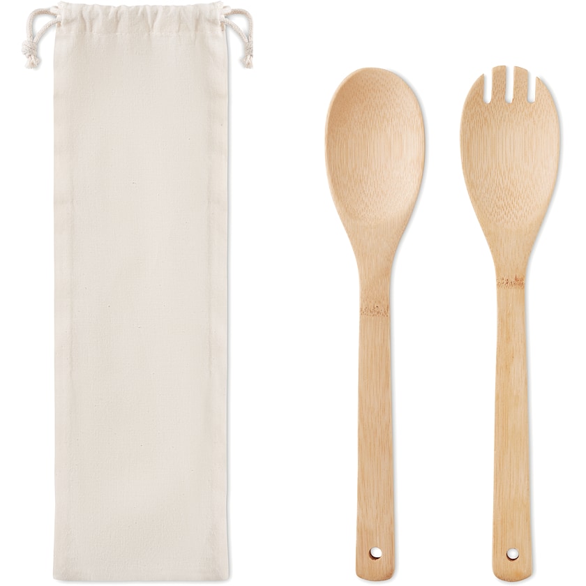Salladsbestick av bambu. Levereras i en naturfärgad påse. Trycket sker på påsen och lasergravyren på ett av salladsbesticken. Bambu är ett naturligt material vilket gör att färgen kan variera.