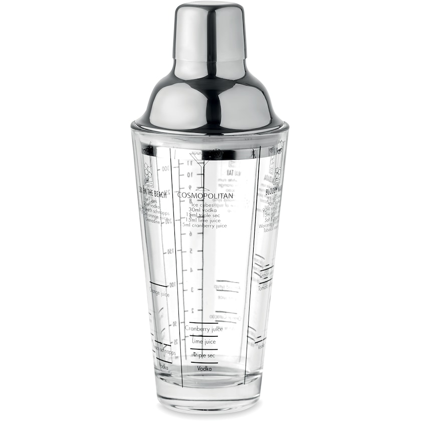 Cocktailshaker av glas med lock av rostfritt stål. Cocktailrecept och mått finns tryckta på glaset. En perfekt present till alla som gillar goda drinkar.