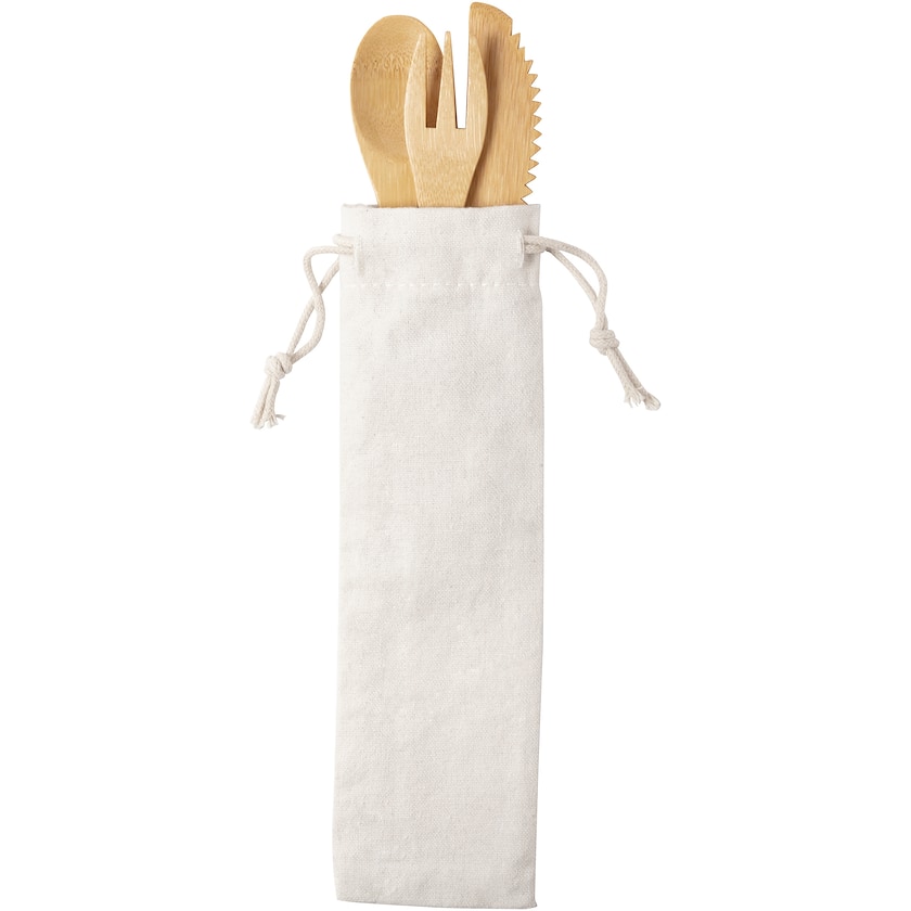 Bestickset av äkta bambu. Setet levereras i en naturfärgad bomullspåse. Märkning kan antingen ske med tryck på påsen eller lasergravyr på ett av besticken.