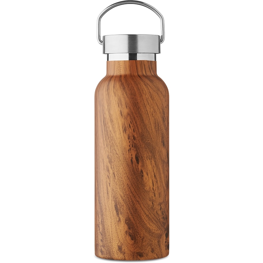 Termos av rostfritt stål med träutseende. Stålet är gjort av 90% återvunnet rostfritt stål och 10% rostfritt stål. Termosen är läckagefri. Märkning kan antingen ske med tryck eller lasergravyr.