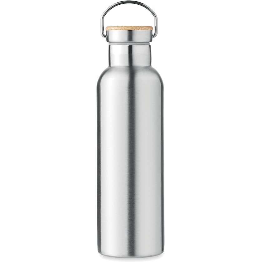 Elegant designad termos med lock med inslag av bambu. Lockets handtag gör att man lätt kan bära flaskan i handen. Välj mellan tryck eller lasergravyr.