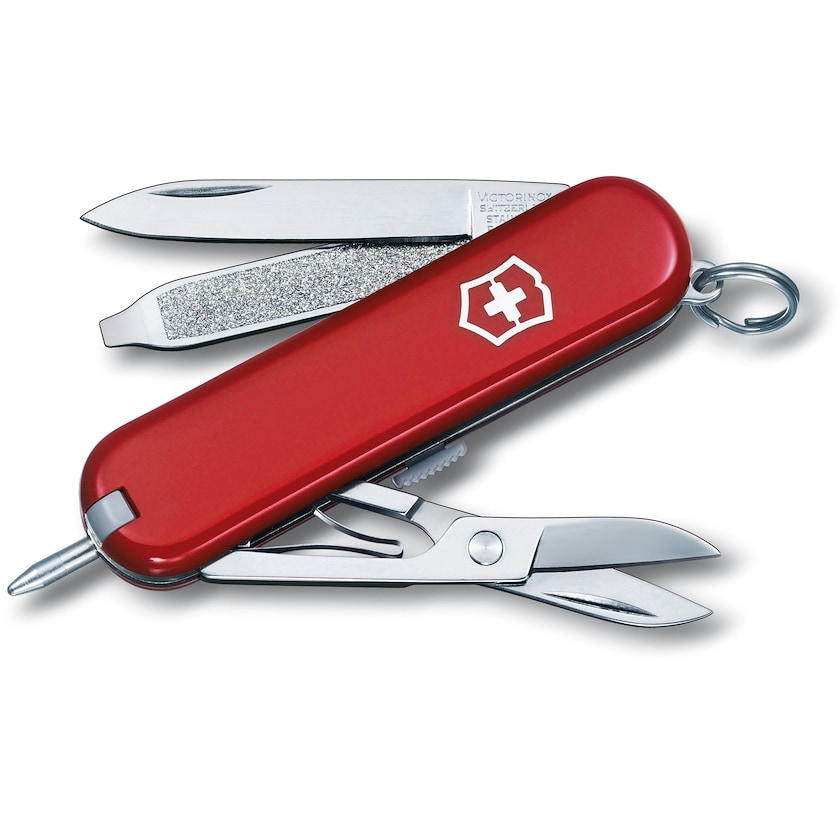 Smart fickkniv med kulspetspenna. Victorinox Signature har samma funktioner som Classic, förutom att nagelfilen är utbytt mot en kulspetspenna. Innehåller ett litet knivblad, sax, nagelfil med skruvmejsel, penna, pincett och sprängring.