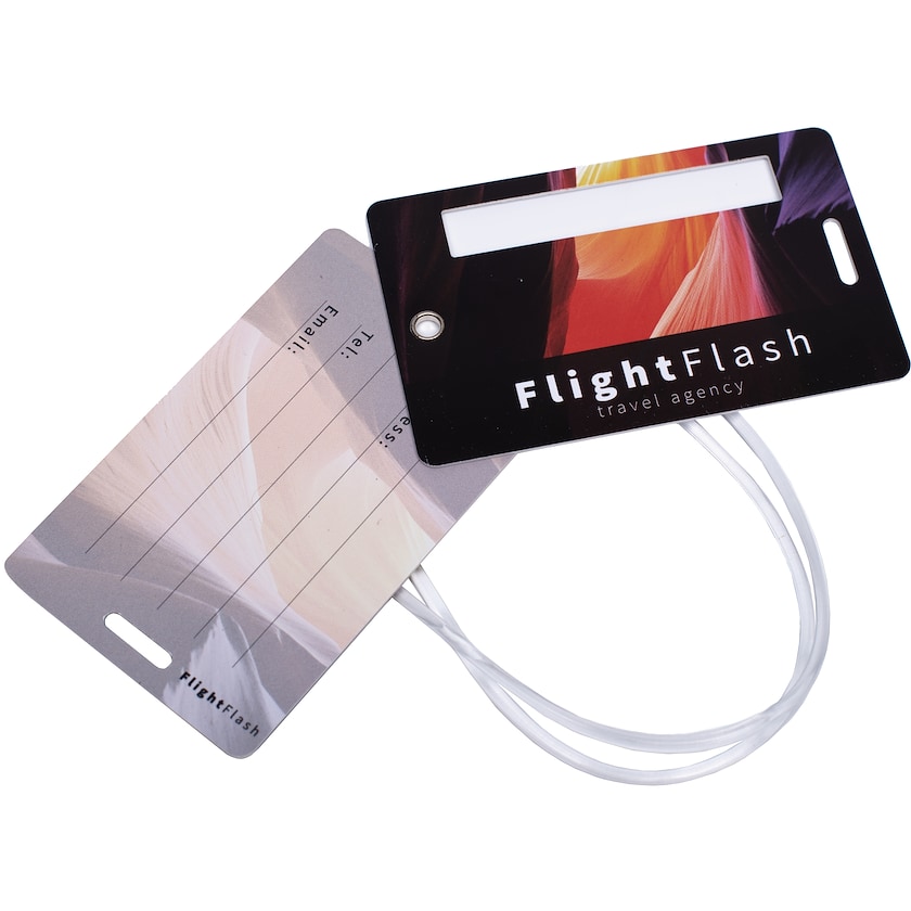 Specialtillverkad bagagebricka av hård PVC. Varje bagagebricka innehåller två kort. Tryckpriset avser digitaltryck över hela ytan på fram- och baksidan på båda korten. Gummirem medföljer.