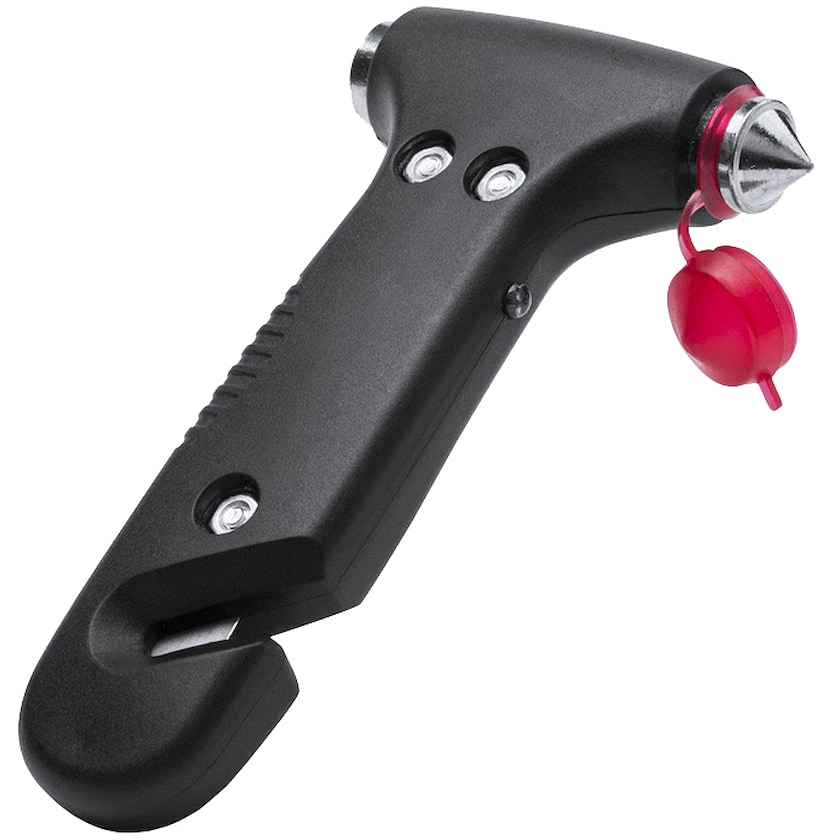 Nödhammare med LED-lampa och bältesskärare. Batteri ingår. En profilprodukt som har potential att rädda liv.
