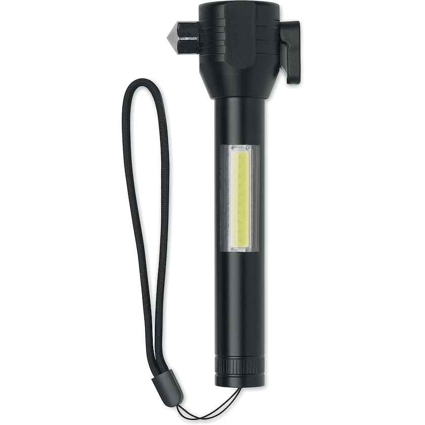 3-i-1-nödhammare med bälteskniv och COB-lampa. Nödhammaren har magnetfäste och handledsrem. Drivs med ett inbyggt laddbart batteri.