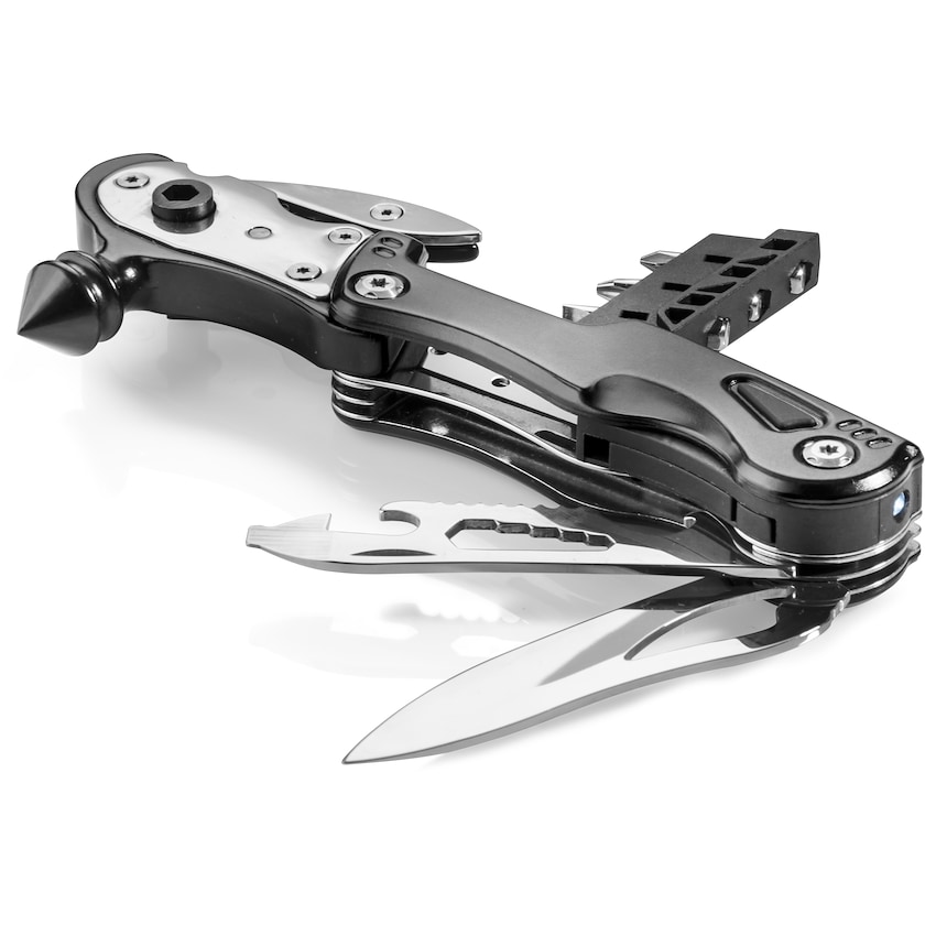 Nödhammare med totalt 11 st olika funktioner. Förutom nödhammare så är den utrustad med funktioner såsom bälteskniv, fönsterkrossare, ficklampa, kniv, 3 bits skruvmejselset, sax, kapsylöppnare m.m. Levereras i ett snyggt svart förvaringsfodral. Märkning sker med lasergravyr.