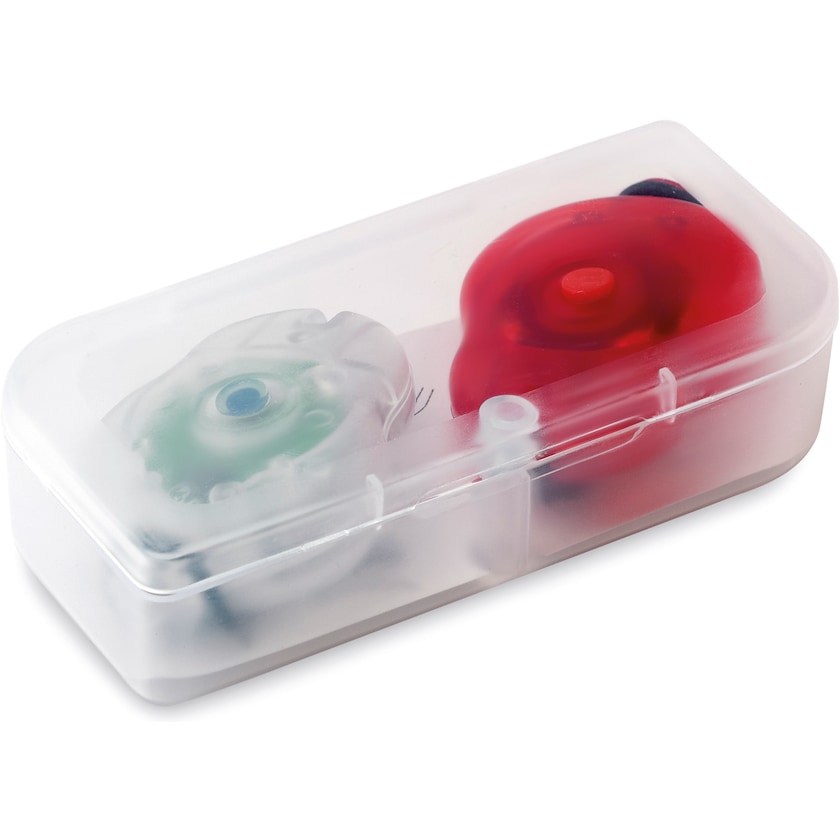 Set med cykellampor. Setet innehåller både fram- och baklampa. Cykellamporna drivs med två knappbatterier (ingår). Levereras i en frostad plastask. Trycket sker på plastasken.