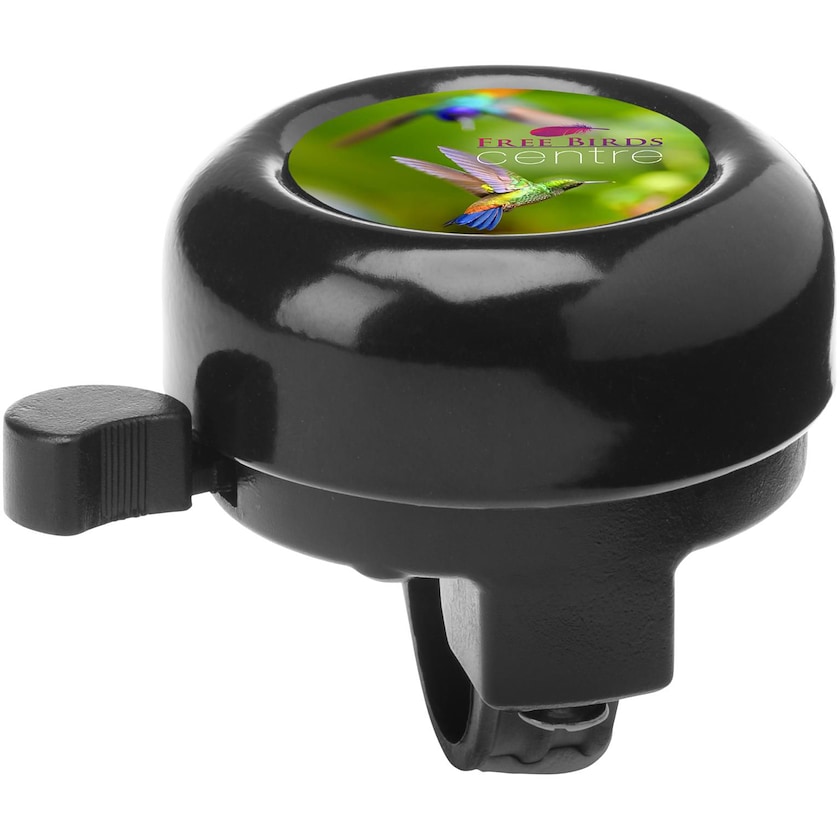 Ringklocka för cykel. Ringklockan är tillverkad av metall. Trycket sker med digitaltryck som placeras under ett skyddande lager epoxy.