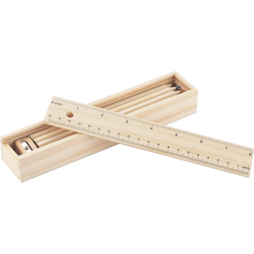 Set med 12 st färgpennor, linjal och radergummi. Märkningen sker på linjalen.