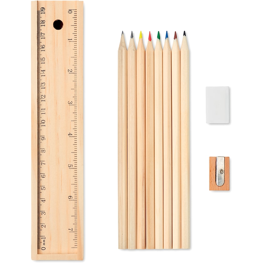 Set med färgpennor i en träask. Setet innehåller 2 vanliga blyertspennor, 6 färgpennor, 1 pennvässare, 1 radergummi och 1 linjal. Linjalen fungerar även som lock för träasken.