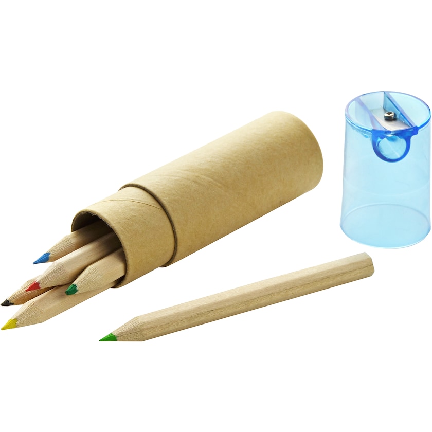 Tub med 6 st blyertsfärgpennor med pennvässare i locket. Trycket sker på papptuben.