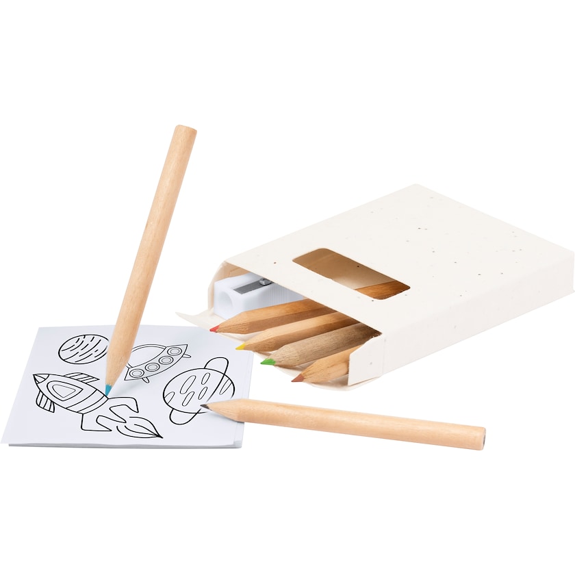 Färgpennor, pennvässare och ritblock i förpackning av fröpapper. Ritblocket har 20 blad. Förpackningen kan planteras efter användning och ger då vackra petunior.