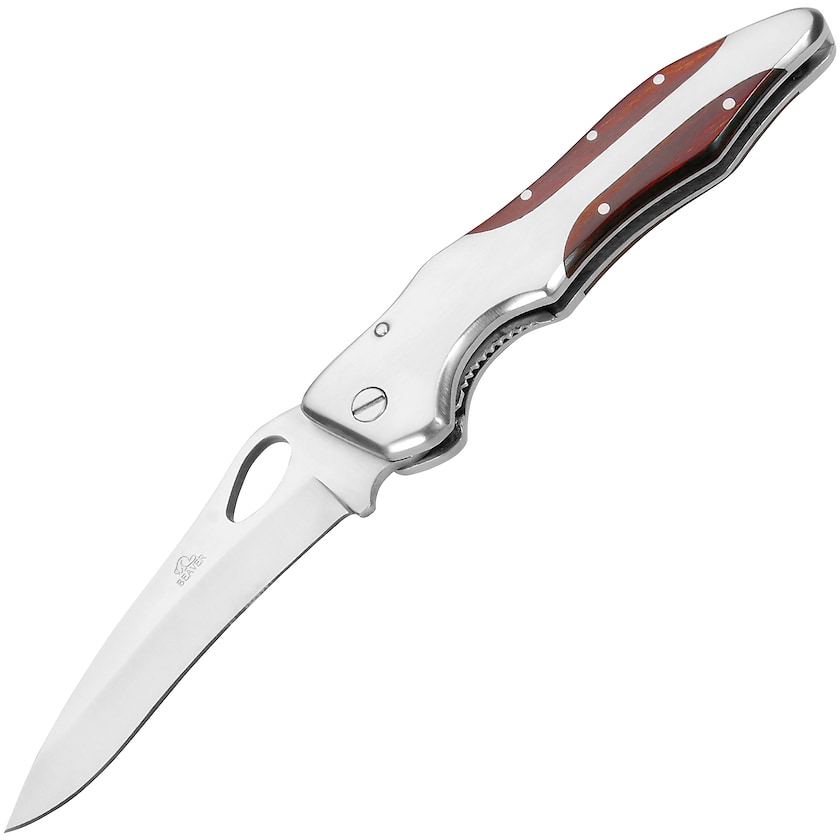 Exklusiv fickkniv med handtag av rostfritt stål och trä. Cupertino har en säkerhetsspärr som förhindrar att knivbladet inte kan fällas ut av misstag. Levereras i snygg presentask.