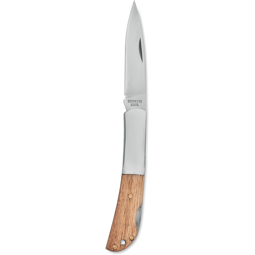Fickkniv av rostfritt stål och handtag av acaciaträ. Bladets längd är 6 cm.