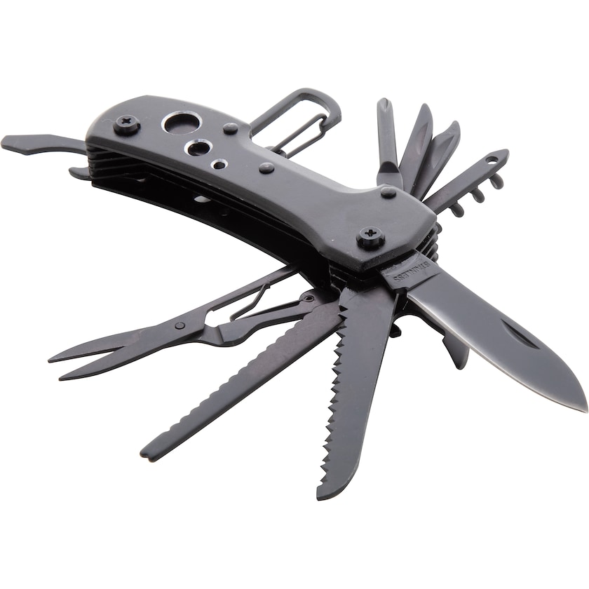Helsvart fickkniv med 13 funktioner. Elburn är gjord av rostfritt stål, förutom handtaget som är gjort av aluminium. Märkning kan antingen ske med lasergravyr eller 2-färgstryck.