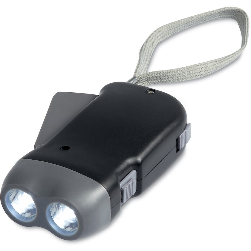 Handdriven ficklampa med 2 st LED-lampor. Ficklampan är försedd med ett praktiskt handledsband. Inget batteri är nödvändigt eftersom ficklampan drivs med handkraft.