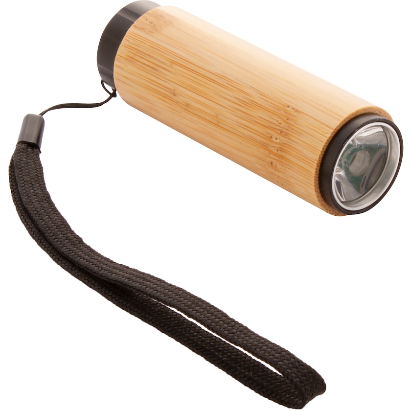 Liten ficklampa av aluminium och bambu. Ficklampan har en stark COB-LED-lampa som drivs med 3 st AAA-batterier (medföljer).