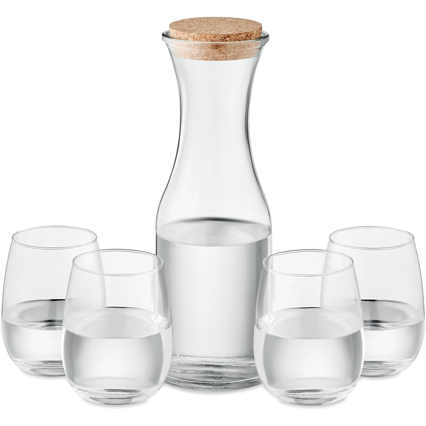 Set med fyra dricksglas och en karaff. Glaset är framställt av återvunnet glas och locket är tillverkat av kork. Karaffen rymmer 100 cl och varje glas rymmer 42 cl. Tryckpriset avser tryck på antingen ett av glasen eller karaffen. Tryckytan på glasen är 30 x 30 mm och på karaffen 40 x 40 mm.