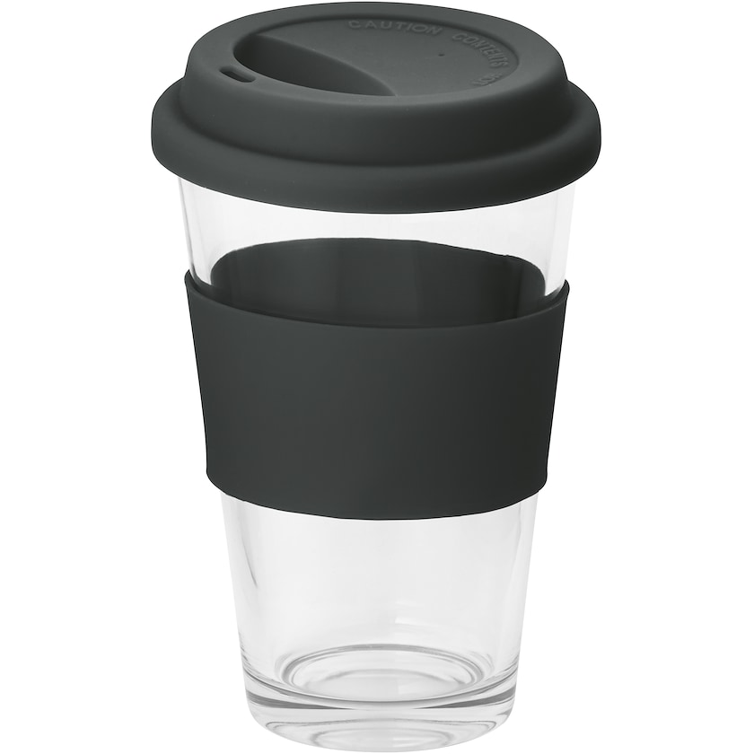 Glas med lock och grepp av silikon. Tack vare greppet passar Perris perfekt för varma drycker. Trycket sker på locket. Endast 1-färgstryck är möjligt.