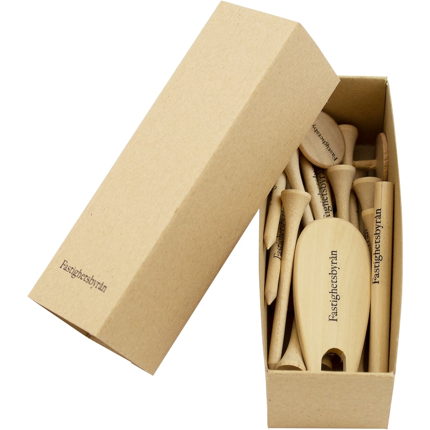 Set med olika golftillbehör. Setet innehåller 20 träpeggar, 2 markeringsknappar av trä, en blyertspenna och greenlagare av trä. Tryckpriset avser tryck på alla föremålen samt pappasken. Endast 1-färgstryck är möjligt.