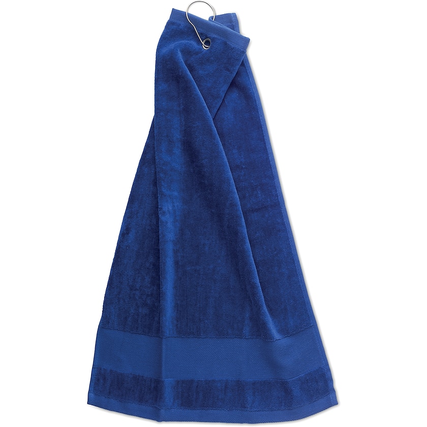 Golfhandduk av bomull. Upptill finns en kopparring som gör att golfhandduken kan hängas på golfbagen. Tyget har en vikt om 350 gram/m².