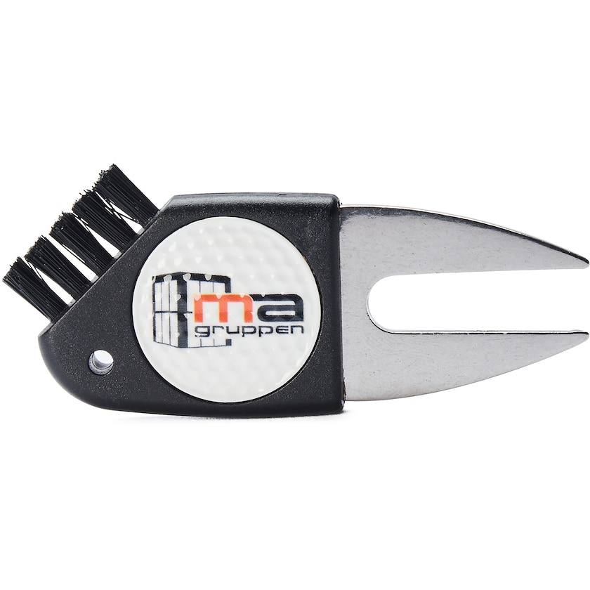 Greenlagare med markeringsknapp och borste för golfklubban. Trycket sker med digitaltryck på markeringsknappen. Markeringsknappen är snyggt dimple-mönstrad.