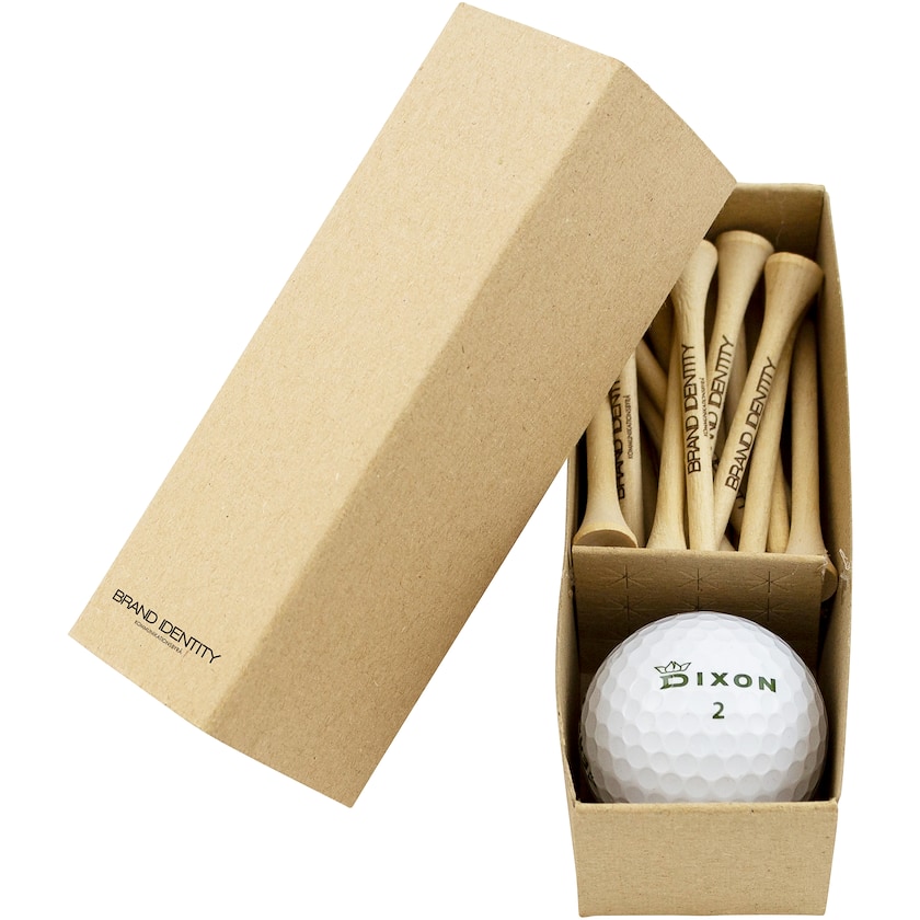 Set med golfboll och träpeggar. Golfbollen är av typen Dixon Earth och peggarna är 20 st till antalet. Tryckpriset avser tryck på golfbollen, peggarna samt pappasken. Endast 1-färgstryck är möjligt.