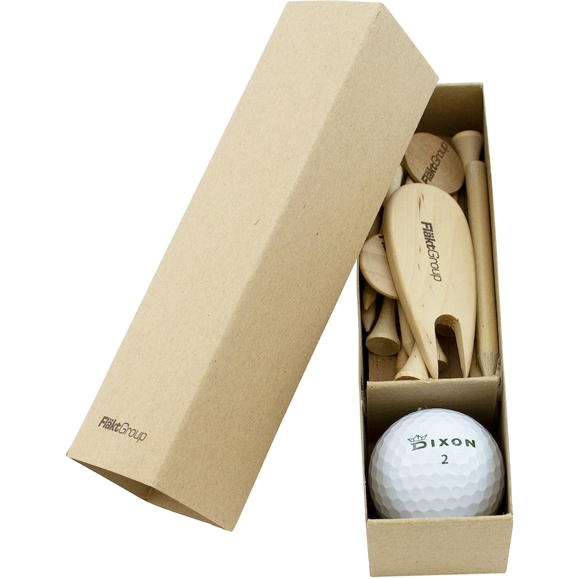 Set med olika golftillbehör. Setet innehåller en miljövänlig golfboll av märket Dixon Earth, 10 träpeggar, 2 markingsknappar av trä, en blyertspenna och en greenlagare av trä. Tryckpriset avser tryck på alla föremålen samt pappasken. Endast 1-färgstryck.