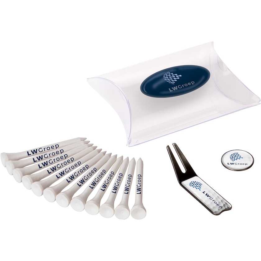 Set med golfpeggar, greenlagare och markeringsknapp. Märkning sker med digitaltryck på förpackningen, på markeringsknappen, greenlagaren samt på de tolv golfpeggarna. Peggarna har 70 mm längd och är gjorda av bambu.