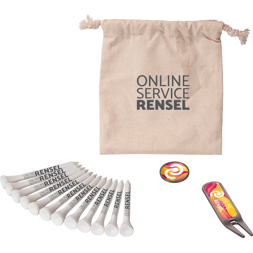 Set med golfpeggar, greenlagare och markeringsknapp i bomullspåse. Golfpeggarna är 70 mm långa och gjorda av trä. Bomullspåsen är tillverkad av ekologisk bomull. Tryckpriset inkluderar 1-färgstryck på golfpeggarna samt digitaltryck på bomullspåsen, greenlagaren och markeringsknappen.