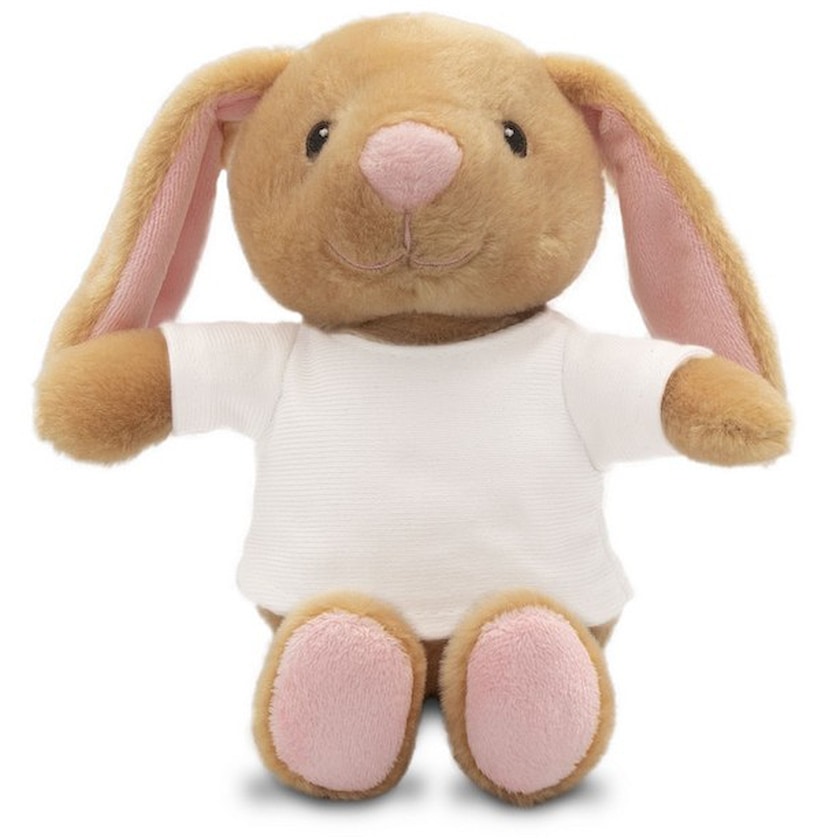 Kramgo kanin med vit t-shirt. Honey är tillverkad av återvunna PET-flaskor (rPET) och är certifierad enligt Global Recycled Standard. Trycket sker på t-shirten som levereras separat från gosedjuret.