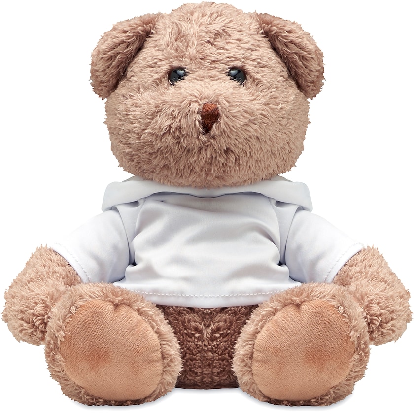 Stor nallebjörn med vit hoodie. Trycket sker på hoodien.