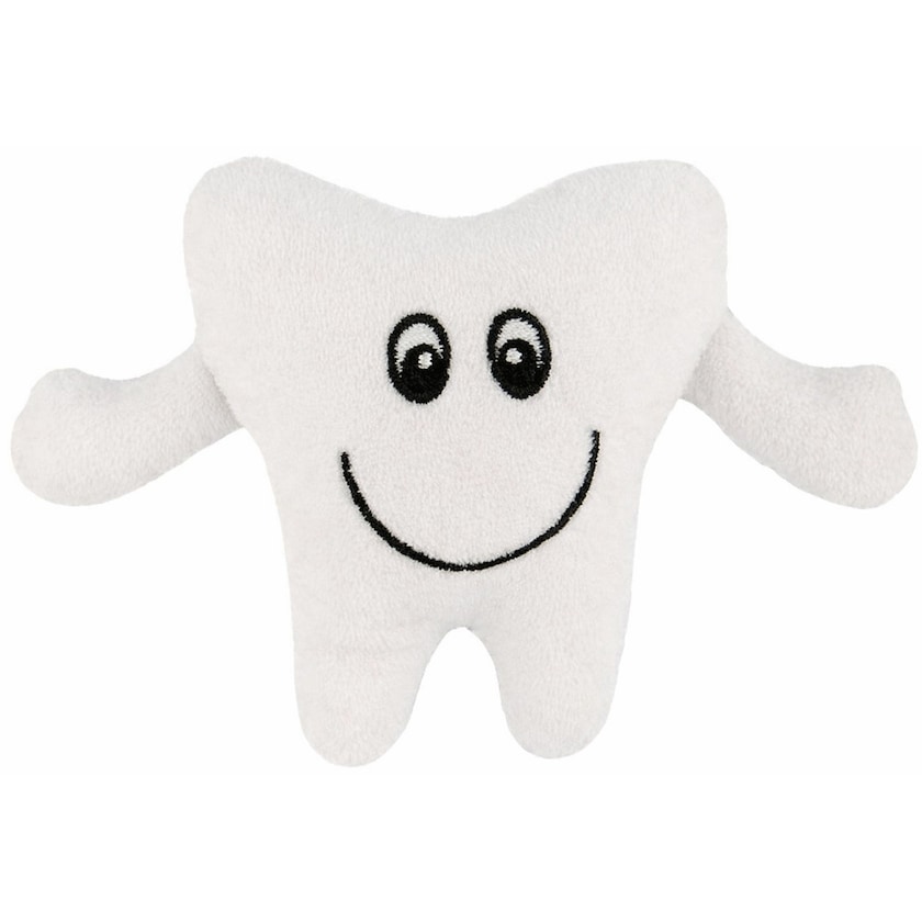 Gosedjur formgivet som en tand. Ögon och mun är broderade. Ditt tryck placeras på gosedjurets baksida.