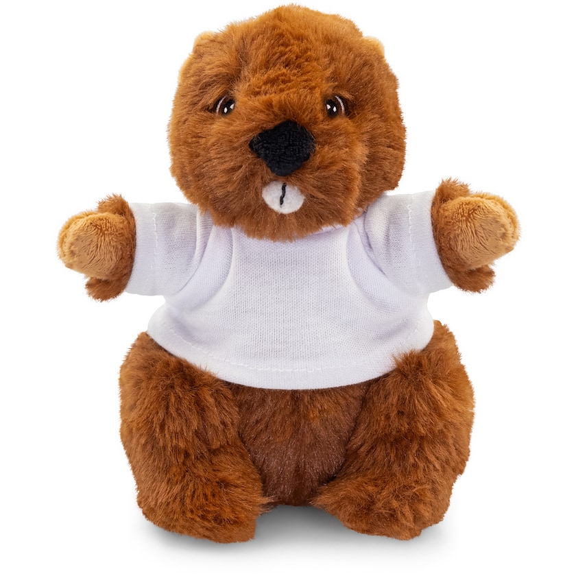 Gullig bäver med vit t-shirt där trycket sker. Köps produkten utan tryck så packas t-shirten separat från gosedjuret.