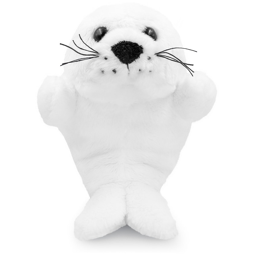 Mjukt gosedjur i form av en vit säl. Trycket sker på sälens mage.