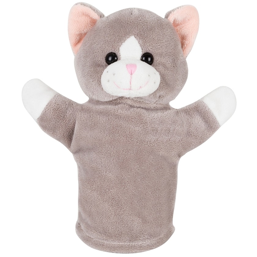 Handdocka designad som en gullig katt. Treyton är tillverkad av behaglig plysch. Trycket sker på handdockans bröst.