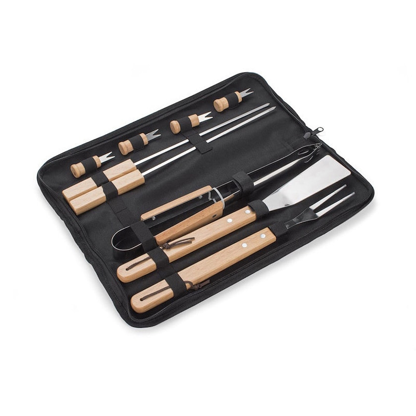 Lyxigt grillset i praktiskt förvaringsfodral. Alla delarna är tillverkad av trä och rostfritt stål. Trycket sker på fodralet.