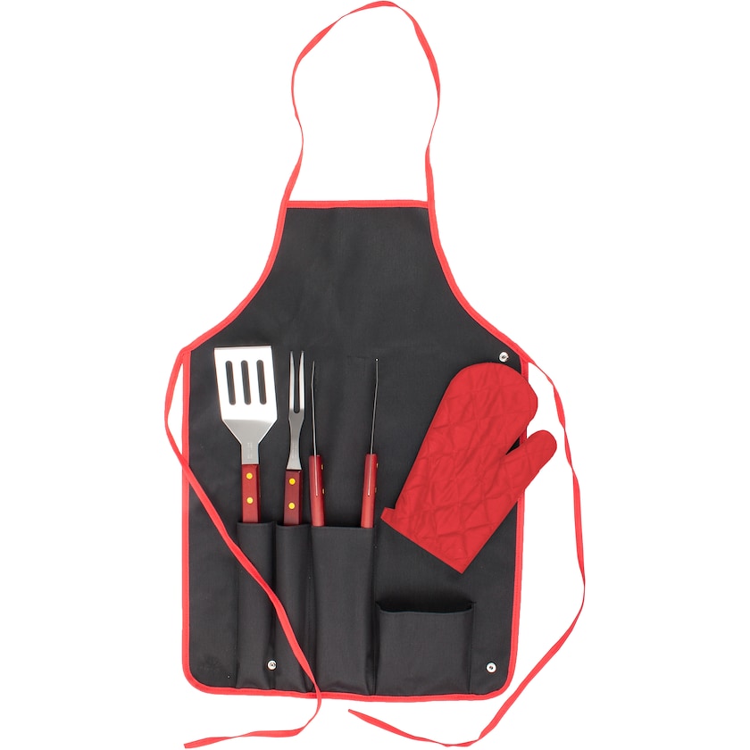 Trevligt grillset med förvaringsfodral och förkläde i ett. Setet innehåller stekspade, grilltång och grillgaffel med trähandtag samt grytvante och förkläde.