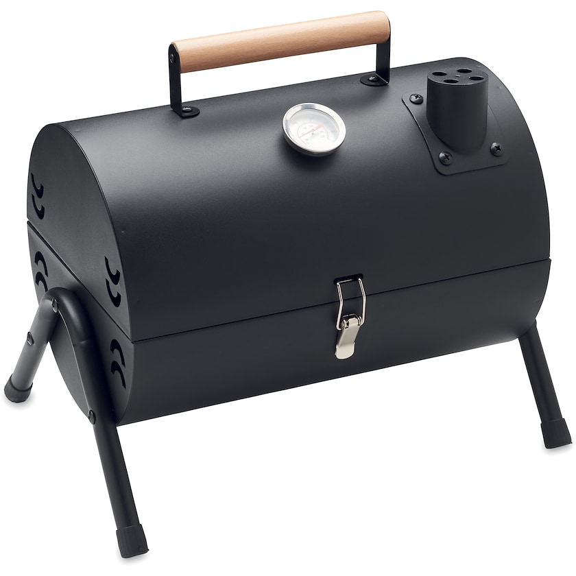 Bärbar grill av robust järn. Bradner är utrustad med skorsten, temperaturmätare samt låsspärr. Metallen är pulverlackerad. Handtaget är av trä.