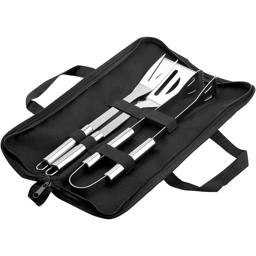 Prisvärt grillset i 3 delar som levereras i ett praktiskt förvaringsfodral. Innehåller grillgaffel, stekspade och tång. Märkningen sker med tryck på förvaringsfodralet.