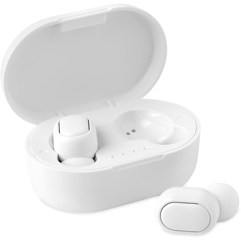 Trådlösa hörlurar av återvunnen ABS-plast. Hörlurarna är av typen True Wireless Stereo 5.0 och har ett inbyggt batteri som ger ca 4 timmars speltid. Förvaringsfodralet fungerar också som laddstation. Mikro-USB-kabel medföljer.