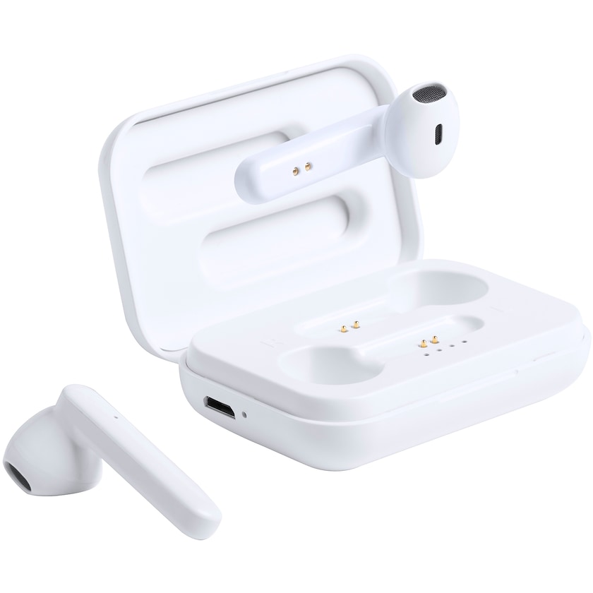 Trådlösa hörlurar i förvaringsfodral. Hörlurarna laddas i förvaringsfodralet. USB-laddkabel medföljer.