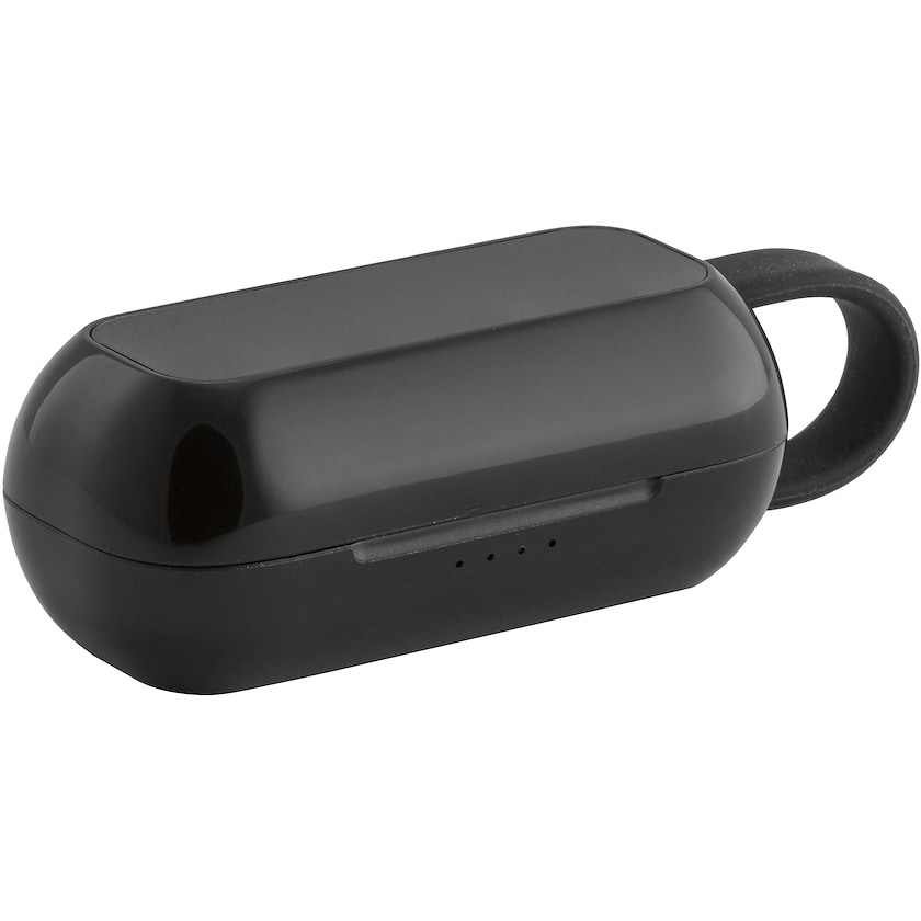 Bluetooth hörlurar i snyggt designad laddningsetui. Hörlurarna drivs med Bluetooth 5.0 och klarar upp till 3 timmars speltid på en laddning. Endast 1-färgstryck är möjligt. Levereras i en presentlåda.