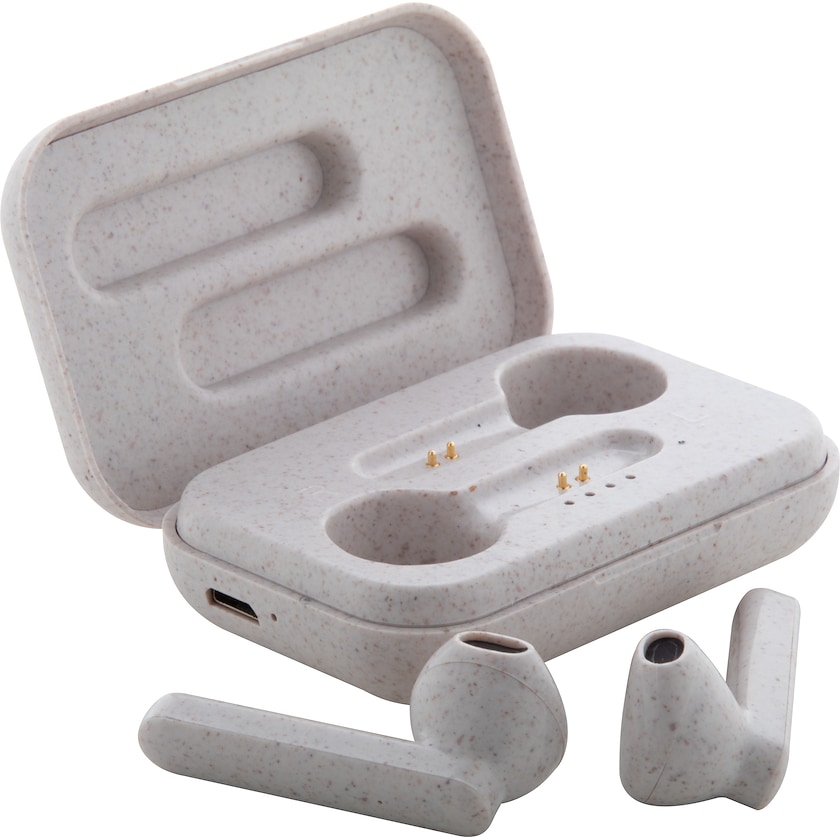 Miljövänliga trådlösa hörlurar med tryck. Higginsport är tillverkade av ekologisk vete-halm. USB-laddkabel medföljer. Levereras i en naturfärgad pappkartong.