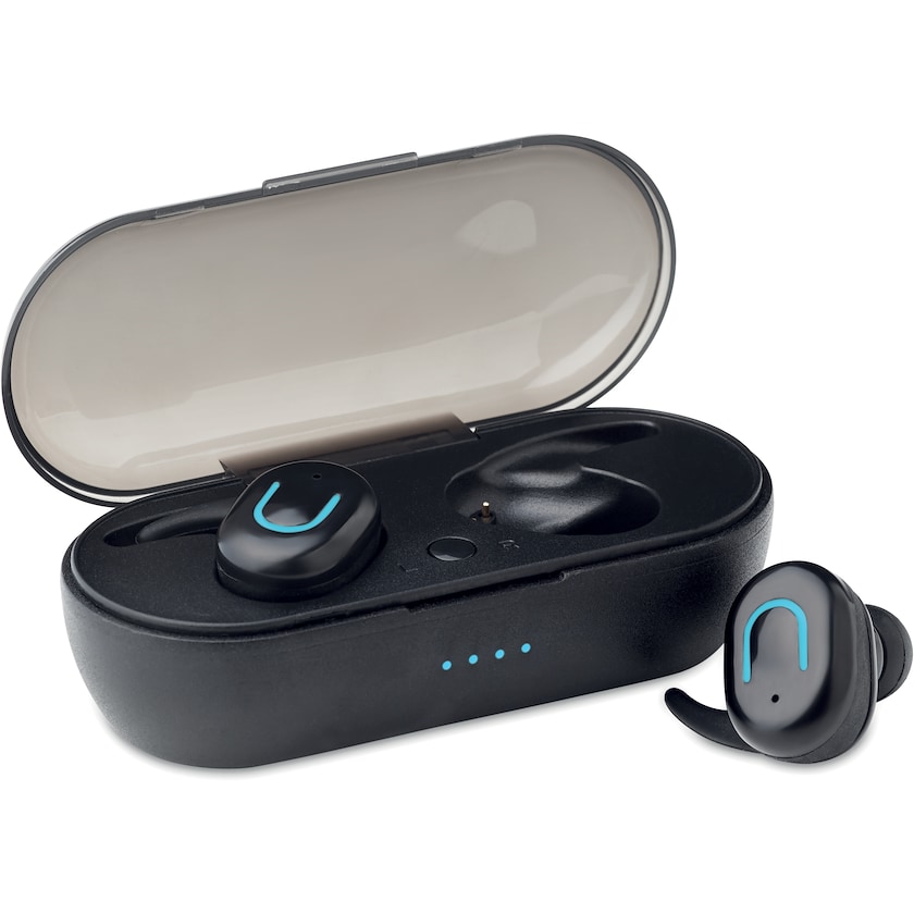 Trådlösa hörlurar med stereo-ljud. Speltiden är ca 3 timmar på en laddning. Mikro-USB-kabel medföljer. Levereras i en ask som också fungerar som laddstation.